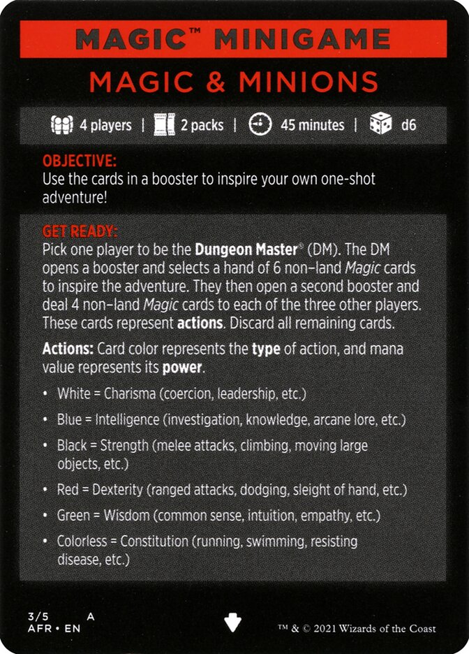 Pick one player to be the Dungeon Master (DM). The DM opens a booster and selects a hand of 6 non-land Magic cards to inspire the adventure. They then open a second booster and deal 4 non-land Magic cards to each of the three other players. These cards represent actions. Discard all remaining cards.